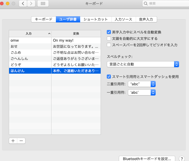 パソコンの設定から、キーボードに行きまして、ユーザー辞書を活用しまくります。便宜的にこの写真ではかなり削除しましたが、僕はこのユーザー辞書に30通りくらいを登録しております。