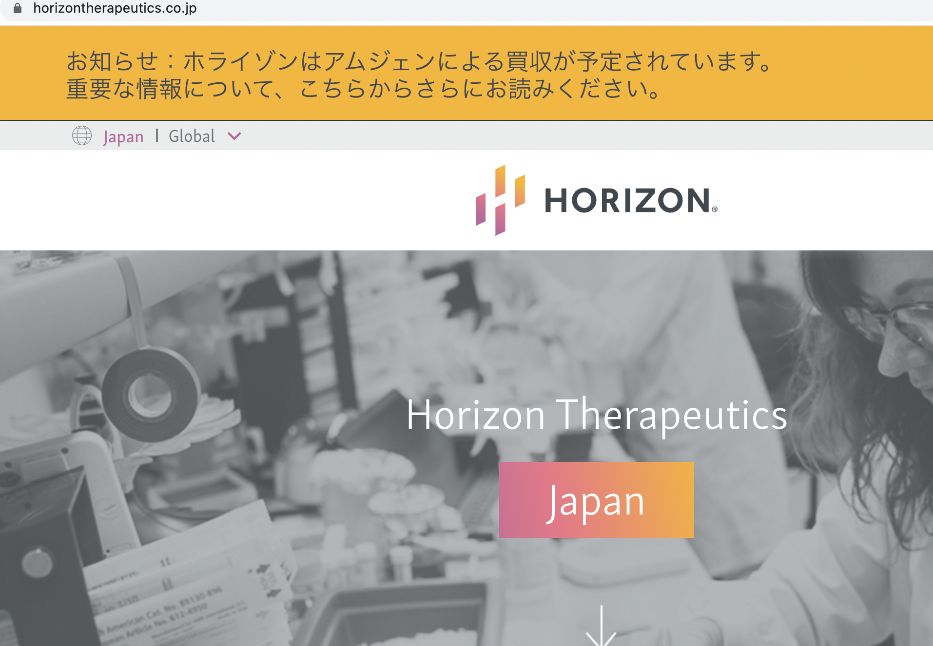 で、そんな矢先に、話は戻って、アムジェンに買収されることになったのです。まー、webを見ますと、せっかくできた日本法人なのですが、その丈夫にオレンジ色のバナーがあって、こんな感じで出てくるのです。
